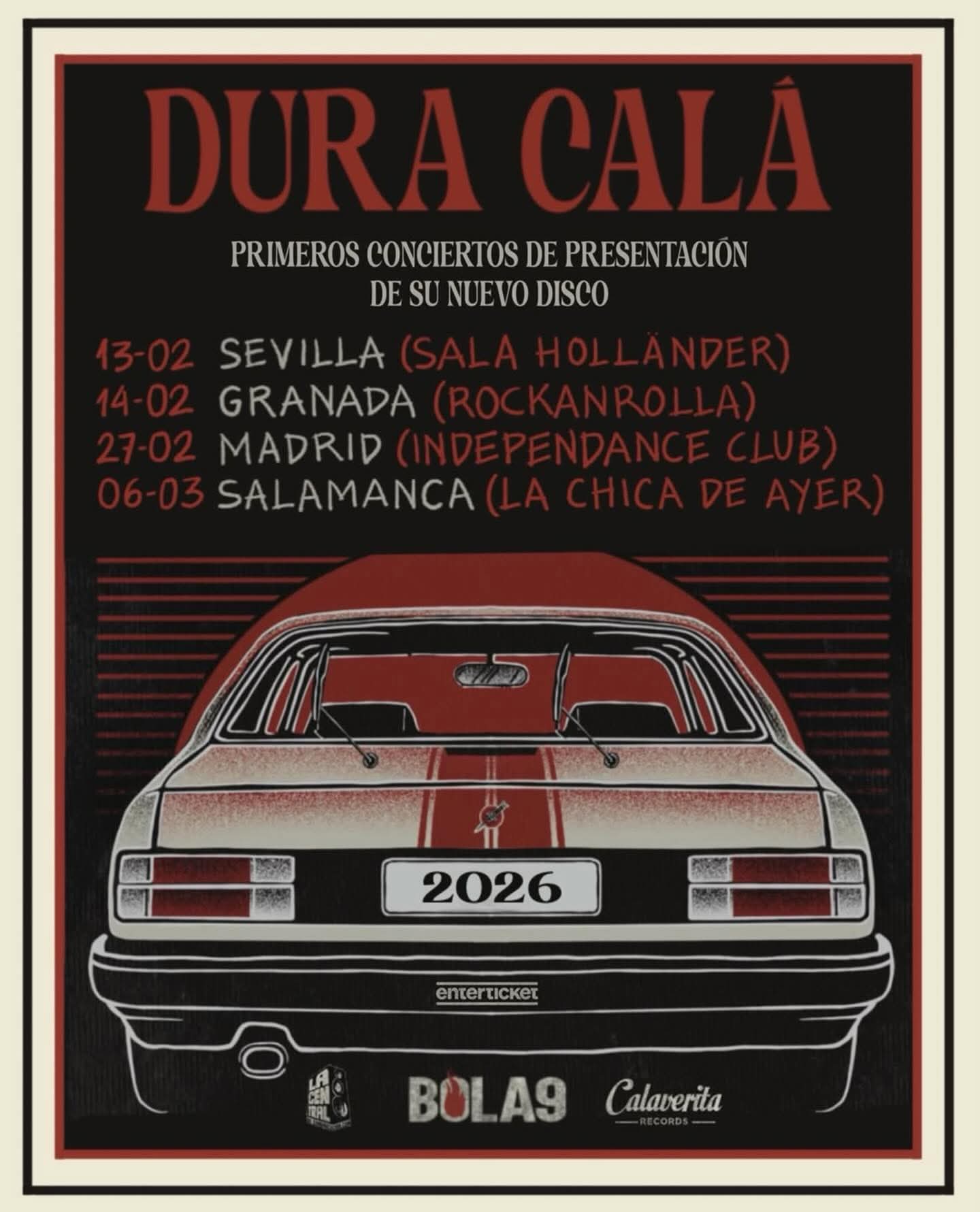 La banda madrileña Dura Calá acaba de lanzar oficialmente su álbum debut titulado «¡Ay!», un proyecto largo esperado por sus seguidores que consolida su sonido genuino y su actitud única dentro de la escena musical española contemporánea. Y ha visto la luz el pasado viernes 30 de enero. Tras varios singles exitosos y una trayectoria ascendente en la escena underground de Madrid, este disco representa el punto de inflexión definitivo para este grupo que fusiona rock urbano, rumba, y lo que ellos mismos denominan “macarreo madrileño”, lo que viene a ser una mezcla de géneros tanto cruda como auténtica.