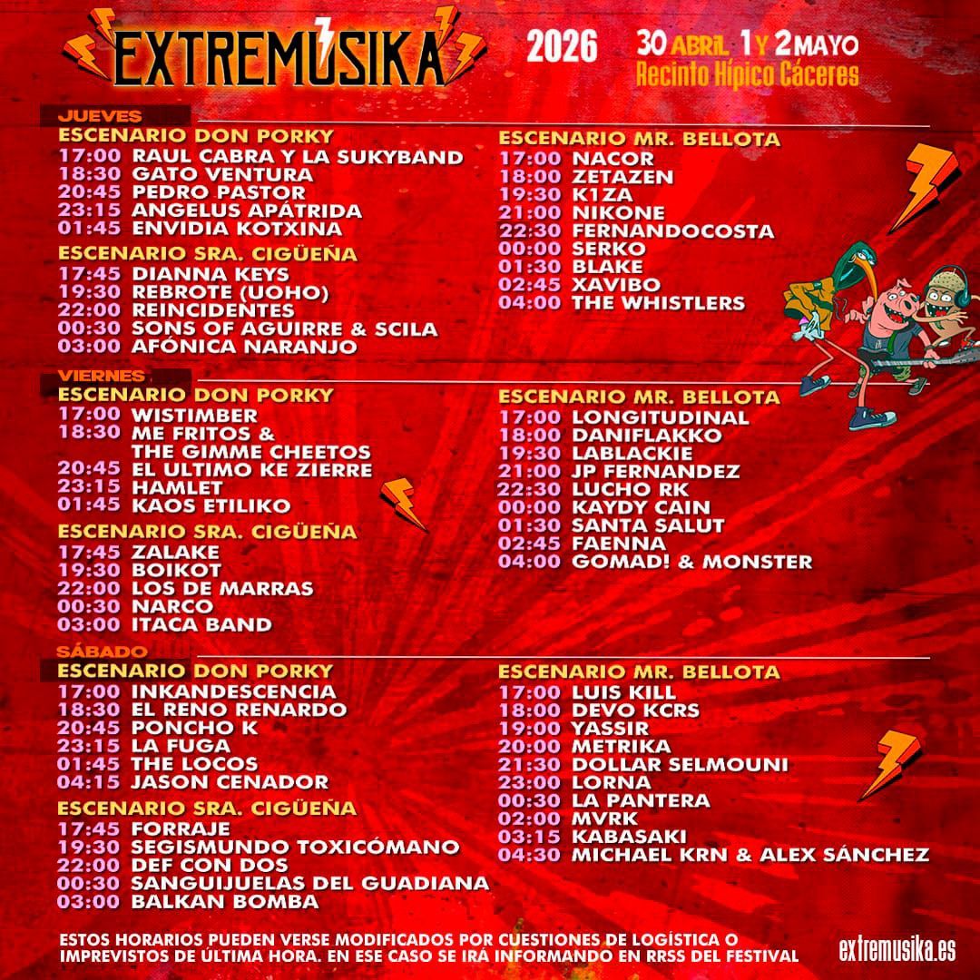La organización de Extremúsika desvela hoy el cuadrante de horarios para su inminente nueva edición, que tiene lugar este próximo fin de semana, jueves 30 de abril, viernes 1 y sábado 2 de mayo en el Recinto Hípico de Cáceres. La programación se divide en tres escenarios principales: Don Porky, Sra. Cigüeña y Mr. Bellota, ofreciendo una ambiciosa oferta musical muy ecléctica que combina rock, fusión, metal, punk, rap-ritmos urbanos y pizca de electrónica.