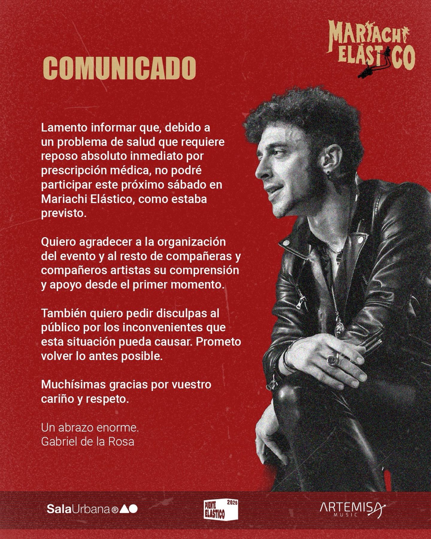 Gabriel de la Rosa, cantante de Shinova, comunica que, por un problema de salud que requiere reposo absoluto por prescripción médica, no podrá participar este sábado en Mariachi Elástico. Agradece la comprensión de la organización y de sus compañeros, pide disculpas al público por las molestias y promete volver lo antes posible.