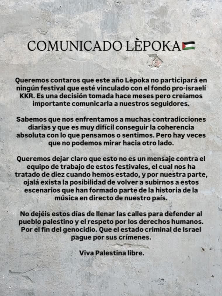 La banda castellonense Lèpoka, conocida por su estilo único que fusiona el folk metal con el espíritu festivo, ha tomado una postura clara frente a los festivales financiados por el fondo de inversión KKR, señalado por su vinculación con intereses pro-israelíes. En un contexto internacional marcado por el conflicto en Palestina y las crecientes denuncias sobre la actuación del gobierno de Benjamin Netanyahu, el grupo ha decidido no participar en este tipo de eventos durante el año en curso.