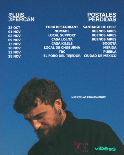 Tras cerrar la gira de Postales Perdidas con un lleno absoluto en el Sala But de Madrid el pasado domingo, Luis Fercán se embarca en una gira por Latinoamérica en la que recorrerá Chile, Argentina y México en distintas citas que os compartimos aquí:
