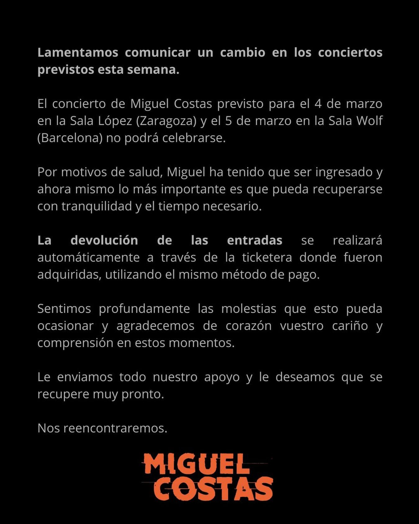 El propio Miguel Costas ha querido dirigirse personalmente a sus seguidores a través de un comunicado oficial publicado en sus redes sociales. En él, explica la situación con transparencia, agradece las muestras de cariño recibidas en las últimas horas y detalla cómo se procederá con la devolución de las entradas adquiridas para ambos conciertos. La organización ha confirmado que el importe de las entradas será reembolsado a través de los mismos canales por los que fueron compradas, siguiendo los plazos habituales establecidos por las plataformas de venta.
