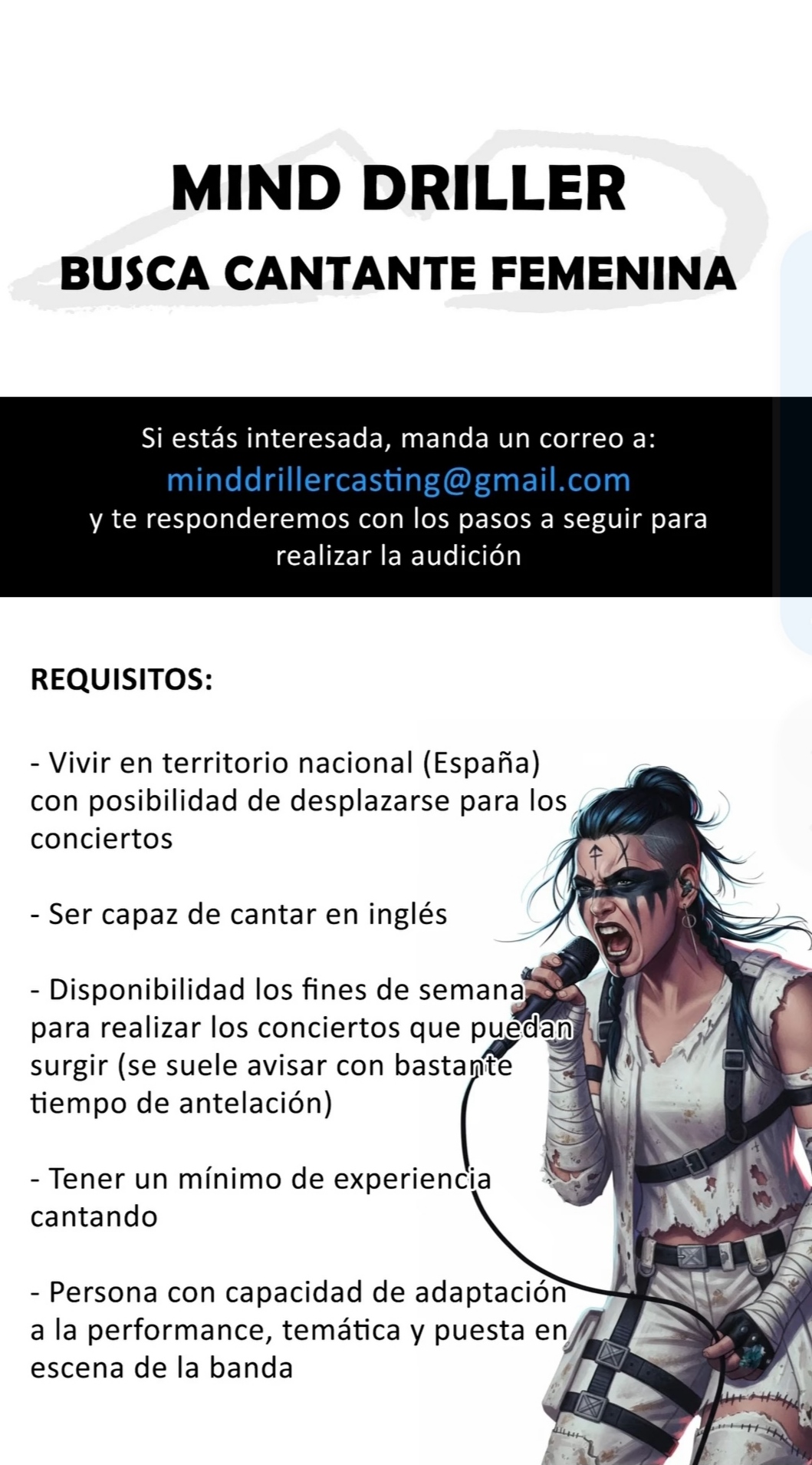 La maquinaria de Mind Driller no se detiene. La banda, conocida por su potente directo y su mezcla de tres voces (femenina, melódica masculina y gutural), ya ha puesto en marcha la maquinaria para encontrar a su nueva voz femenina.