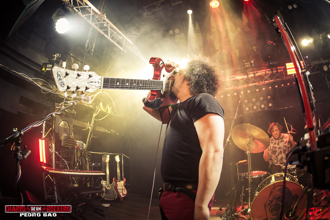 Y ahora pasamos a centrarnos en el concierto. En primer lugar, dio comienzo de manera puntual, a la hora prevista, y una hora después de la apertura de puertas, es decir a las 21:00 horas. Y además, entorno a unas 300 entradas vendidas, empezaba una noche cargada de buenas vibraciones con Hermana Furia y un público generoso. Arrancaba con una intro en la que se sucedían unas imágenes en la pantalla situada encima del escenario, con interferencias que nos llevaba a la portada del disco a presentar, y llevándonos en un viaje espacial temporal de un agujero de gusano por un túnel. De pronto un as de batería dio paso a un solo, para dar paso al inicio con toda la banda ya sobre el escenario, mientras se sucedía el primer tema de la noche que no fue otro que «Grita Con Furia». Después de esta entrada genuina, saludaban: «¡Buenas tardes somos Hermana Furia!». Y la euforia del público se apoderó de la sala. Pero de pronto llegó «Matar A Alguien», donde el funky y el stoner se se hacían con el control de esta canción, y el bajo de Pau C. Marcos contaba con partes más rítmicas. Y finalmente los allí presentes terminaron entre aplausos. Seguidamente le tocó el turno a «Dame Vida», otro de los temas su primer álbum título «Todo Mal», como los anteriores. Pues aquí pudimos ver a Edu Molina ganando más protagonismo a la voz. Este iba cogiendo forma con dinamismo y movimiento.