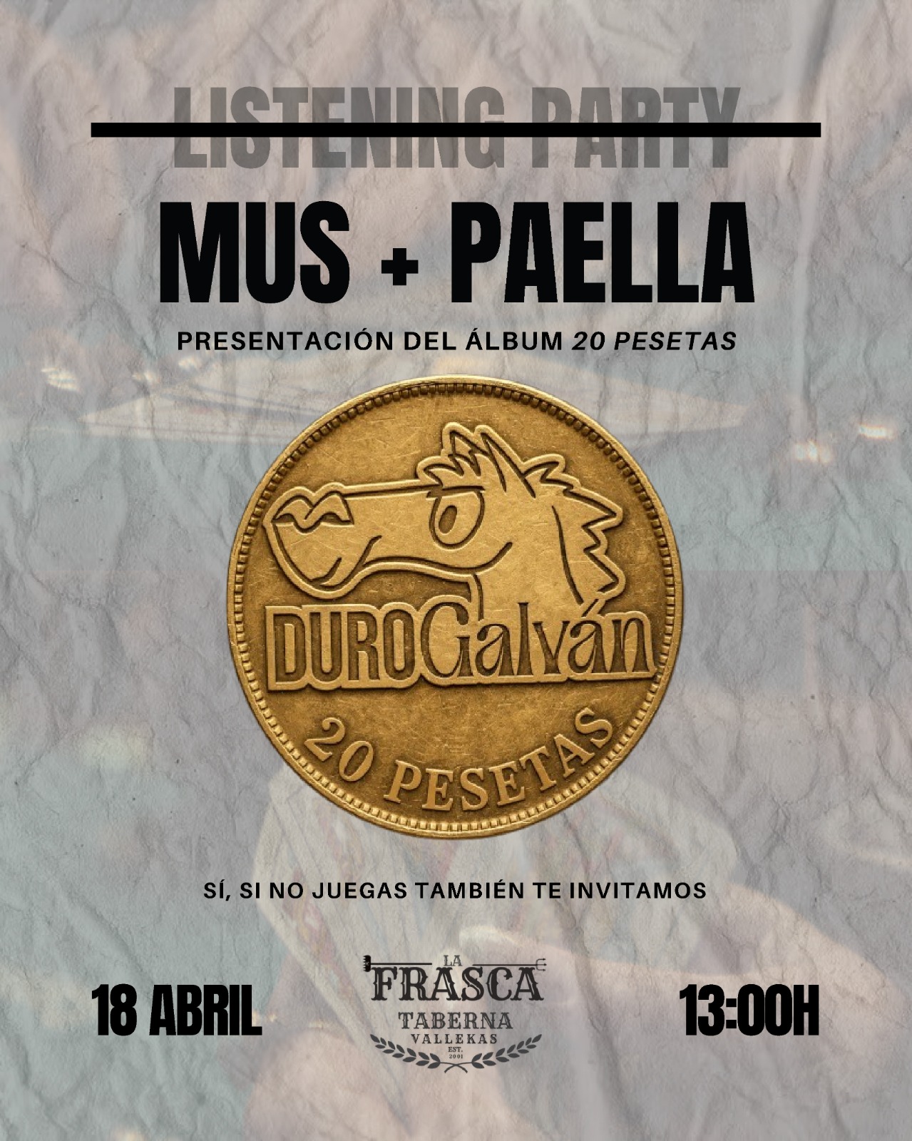 La agenda de Duro Galván continuará al día siguiente, el sábado 18 de abril, con una presentación más cercana y desenfadada de “20 Pesetas” en el bar La Frasca. Este evento incluirá un torneo de mus y una paella popular, apostando por un formato que mezcla música, tradición y convivencia entre fans y banda.