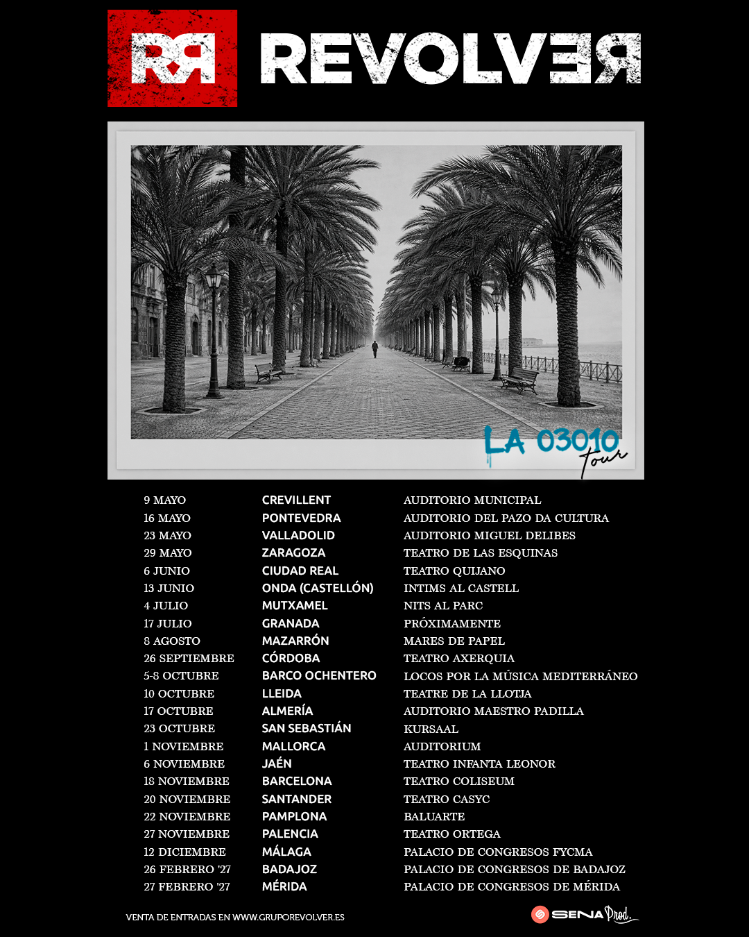 Mientras esperamos el lanzamiento de «LA 03010″, disco que ocupará la posición 22 en la discografía de Revolver, ya se han publicado las primeras fechas de la gira presentación que suman 23 citas y que llevará al grupo de Goñi por los teatros y auditorios de todo nuestro país. Las entradas para estos primeros conciertos estarán disponibles a la venta a partir del próximo 10 de febrero en la página web oficial del grupo.