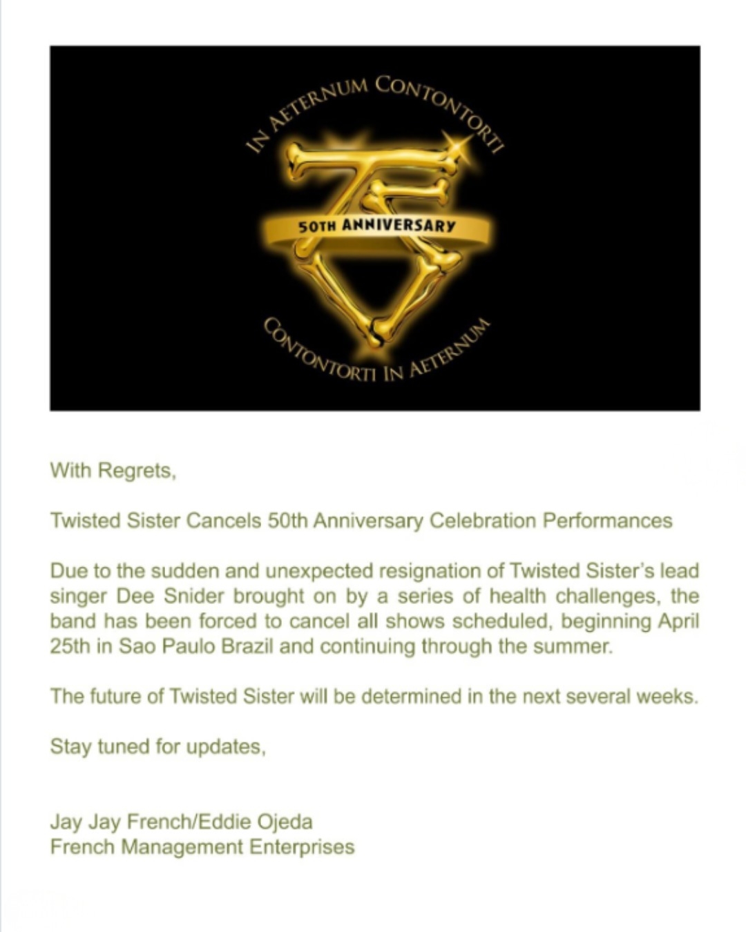Desde Z! Live Rock Fest nos llega la siguiente  comunicación a cerca de la cancelación de la gira Twisted Sister, donde se iba a conmemorar su 50 Aniversario. Al parecer, los motivos principales apuntan a que afecta a la salud de la banda.