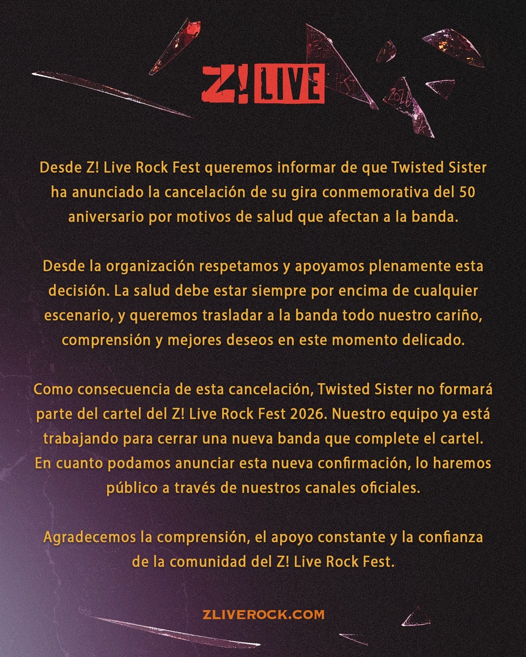 Como consecuencia de esta cancelación, Twisted Sister no formará parte del cartel del Z! Live Rock Fest 2026, y como veníamos informando de otros dos festivales más en nuestro país. El equipo que forma parte  del festival zamorano, ya está trabajando para cerrar una nueva banda que complete el cartel. En cuanto podamos anunciar esta nueva confirmación, lo haremos aquí  con una nueva noticia. La organización ha indicado que, lo hará público a través de sus canales oficiales, que son las redes sociales.