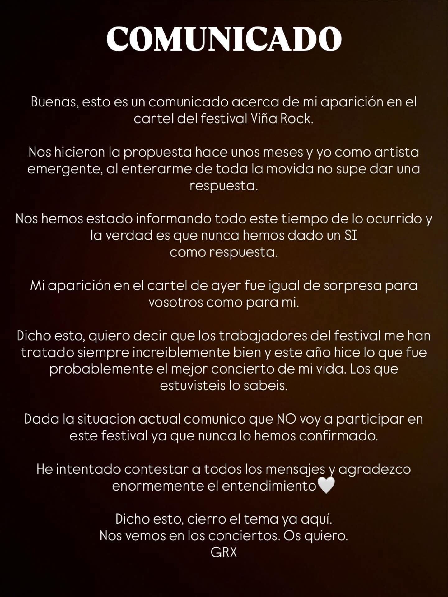 Por su parte, Grex también ha tomado su decisión de no participar en el festival. En un comunicado ha comentado la artista, que se ha informado previamente antes de tomar una decisión definitiva.