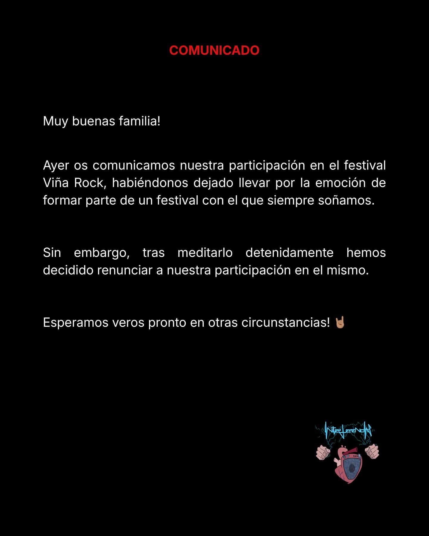 Otra de las bandas emergentes, Interferencias, ha comunicado que no participará en el festival tras meditarlo. Igualmente espera ver a su público en otras circunstancias.