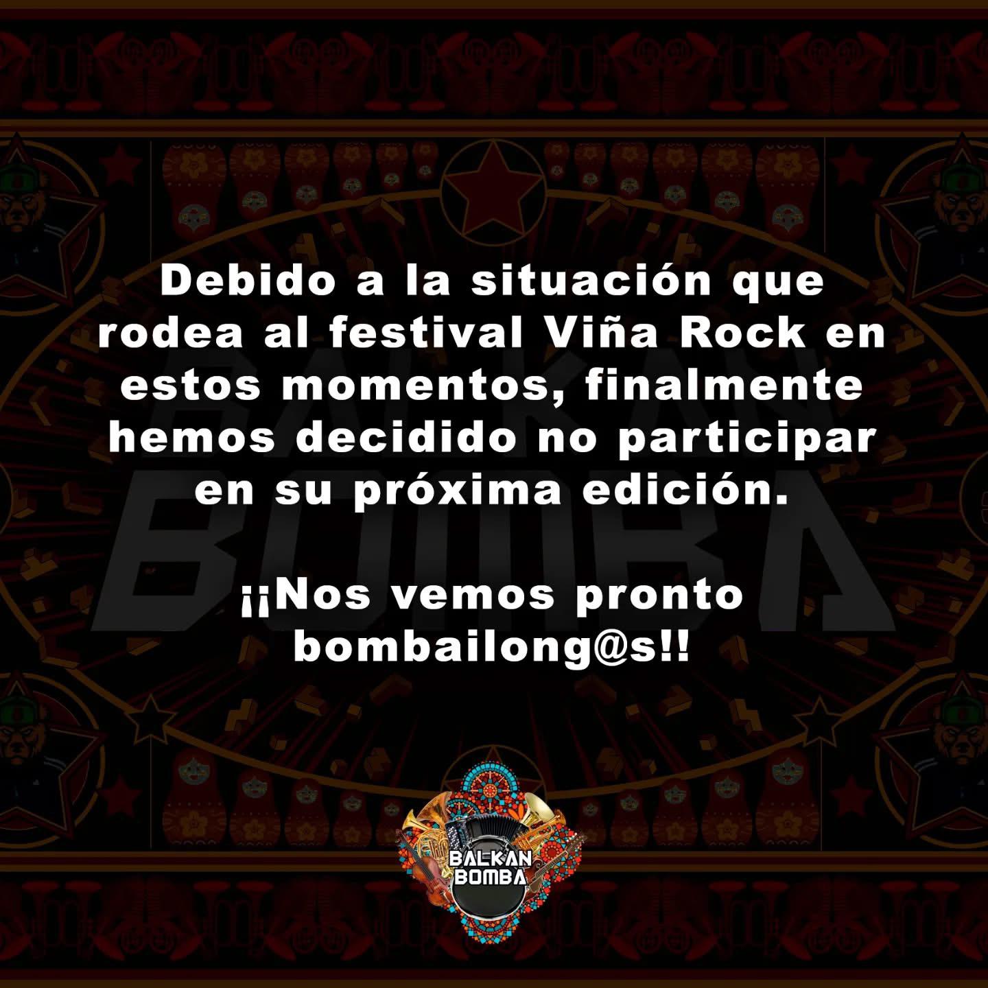 Por un lado, Balkan Bomba anunció que no participará finalmente en el festival. La banda ha tomado su decisión, y todo apunta a que pueda estar relacionado con la presión social recibida en redes. Previamente, el grupo había afirmado que seguiría adelante con su actuación mientras no hubiera pruebas de las acusaciones difundidas en redes sobre una supuesta financiación del festival por parte del fondo KKR. Ante la polémica generada, la banda decidió retirarse.