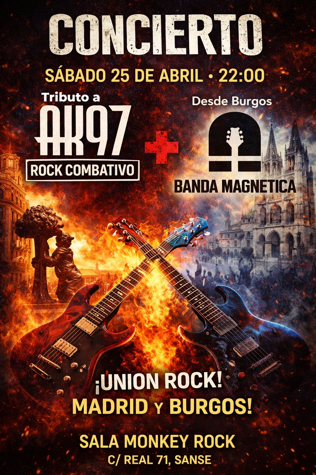 Madrid y Burgos unirán fuerzas en una noche, donde el rock combativo estará aún más presente. Dos bandas, dos propuestas musicales como son AK97 y Banda Magnética, que no dejarán a nadie indiferente. Juntos unirán su talento para lograr una puesta en escena de gran nivel y alto impacto, con una actuación impactante que destacará en el escenario.