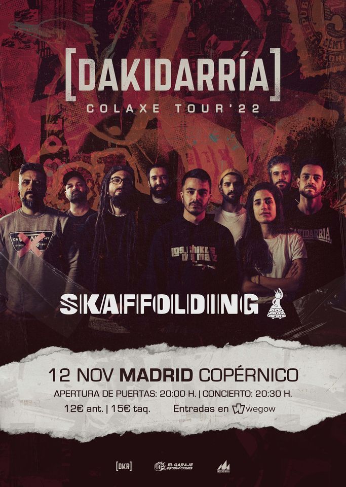 Dakidarria vuelve a la capital después de más de 2 años sin pidarla. Traerán una formación llena de cambios, que todavía no hemos podido conocer sobre los escenarios aquí en dicha ciudad. Seguidamente presentarán su nuevo disco titulado «Colaxe», el sexto álbum de su carrera. Ha sido grabado en los estudios A Carpinteria y masterizado en Santa Cruz Recording Studios. En este trabajo una vez más nos ofrecen temas de Ska, Reggae y otros sonidos en lengua gallega. Además han tenido la suerte de poder contar con la colaboración de las chicas de Tantxugueiras, Boikot, Evaristo Paramos y mucho más. Y además cabe señalar que después de todo lo trabajado, cuentan con una trayectoria de casi 20 años. Por último y en esta ocasión vendrán acompañados por el grupo de Ska, Reggae y Cumbia madrileño Skaffolding conocidos por su numerosas versiones, que las vuelven muy pegadizas.