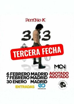 Tras agotar las fechas de febrero en Madrid en la sala Mon Live previstas para los días 6 y 7, Poncho K saca una tercera fecha más en la misma sala de la capital, pero está vez para el 30 de enero.