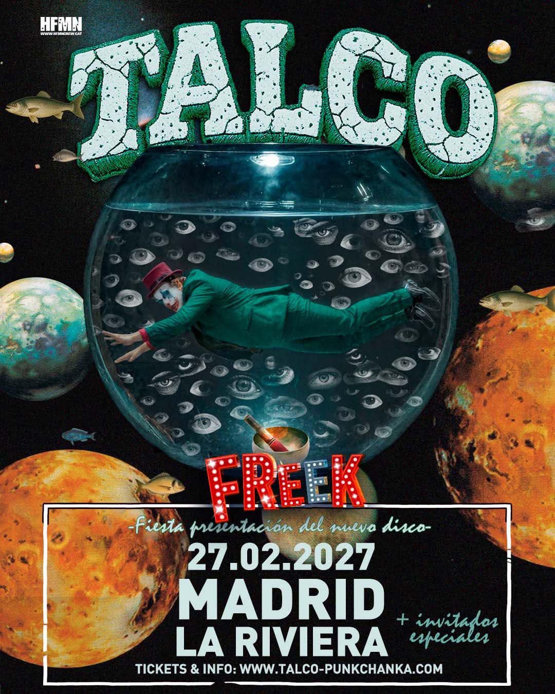 Talco llega a Madrid en el marco de la gira de presentación de su nuevo disco, “Freek”, un trabajo que mantiene intacta la esencia reivindicativa del grupo, pero que también explora nuevos matices sonoros. Con este álbum, la banda demuestra una vez más por qué es una referencia internacional dentro del punk y ska europeo, combinando letras comprometidas, melodías contagiosas y una energía arrolladora en directo.