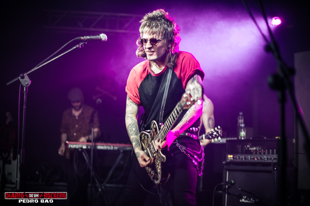 Después de lo dicho pasamos al meollo de la cuestión, es decir, a la actuación en directo de Dura Calá. El concierto empezó bastante puntual. Y después de una espera con una selección musical bien variada, que amenizó ese tiempo con canciones de El Fari, Derby Motoreta’s Burrito Kachimba, Manolo Escobar, Los Chunguitos, entre otros, sonaron los primeros acordes de «La Macarena». Con ello iniciaba una noche deluxe, con un público bien variado en cuanto a edades se refiere (30-50). Sin dudarlo, interpretaron todo el disco al completo, sin dejar ningún tema en el olvido. Cada canción se iba sucediendo entre palmas, que iban al compás de la música, y El Niño, el teclista del grupo, era el encargado de dirigirse al público con aspavientos y haciendo los honores para todos y todas. También, nos llevó a revivir la feria de barrio o de pueblo, que se montan cuando llegan sus fiestas. Lo hizo con ese sonido tan característico, que se escucha en los coches de choque, y que él supo recrear con su teclado. Por otra parte, Klavo, uno de los guitarristas, de ejecutar una guitarra eléctrica Fender Stratocaster, pasó a una de tipo Flaying V y después a una Gibson Les Paul. Y un apunte a destacar es que, sobre el escenario pudimos contar tres guitarras y no dos, como estamos acostumbrados a encontrar en las bandas, lo que nos llamó la atención positivamente, dándole más relleno a las composiciones y más empuje.