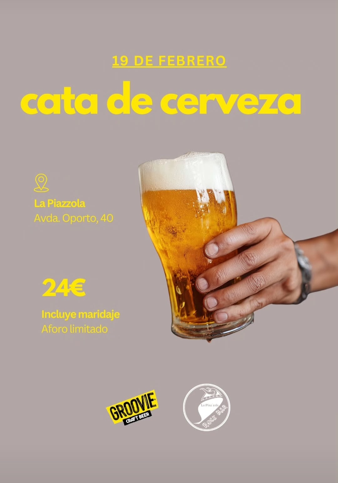 El próximo jueves 19 de febrero, la reconocida cervecería La Piazzola, situada en la Avd Oporto 34, en los bajos de Opañel prepara su próxima cata de cervezas artesanas. En esta ocasión, será con Groovie.
